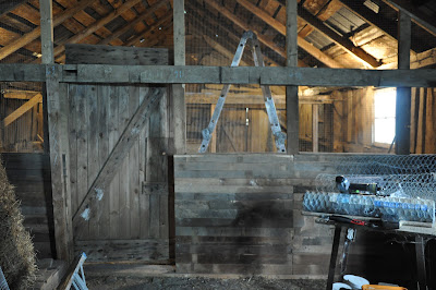 It began with a plan; create a coop in the back third of the existing woodshed, complete with hip wall, framed-in chicken wire and an old barn door. We set to work cleaning out and hosing down before gathering reclaimed wood from the old house to begin the build.